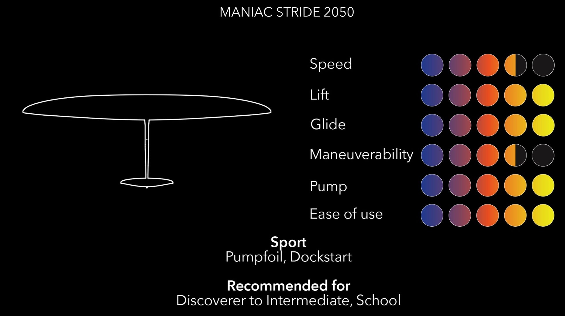 Il MANIAC STRIDE è progettato per offrire il modo più semplice di provare l’emozione di volare sull’acqua. Con elevata stabilità, decolli senza sforzo e pompate fluide, è la scelta perfetta per chi inizia con il pump foiling. Grazie all’eccezionale portanza a basse velocità e all’alta efficienza, rimarrai sul foil più a lungo con meno fatica, accelerando la tua progressione. La scorrevolezza ultra-morbida garantisce divertimento anche dopo le prime sessioni. È un foil che vorrai sempre nella tua collezione: ideale nelle giornate senza vento per condividere il divertimento con gli amici.