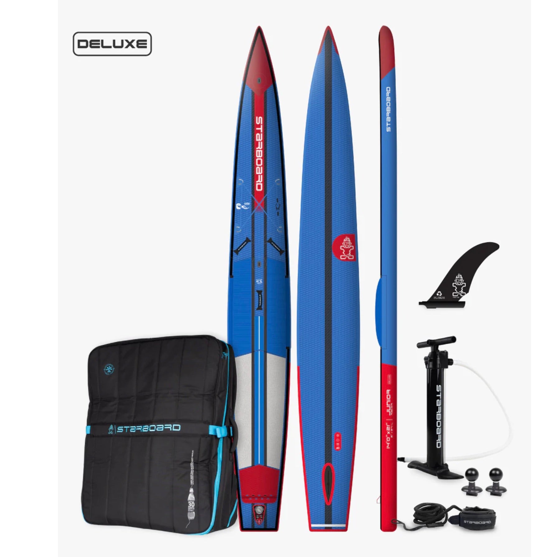 Depending on the version, it includes Race 23 fin, Tiki pump, leash, bag and repair kit (and additional accessories such as Starmount/Tiki key on the Deluxe).