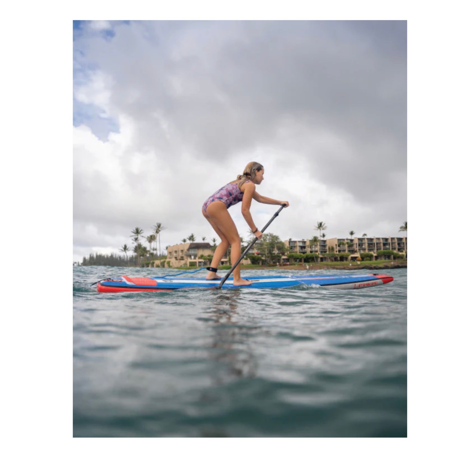 Includes: lightweight leash, Tiki double action pump and wheeled bag. Note: Due to the EVA side walls (standing tray), some versions should be folded and not rolled up : the bag is therefore wider and shorter for quick packing and to preserve the shape of the side walls.